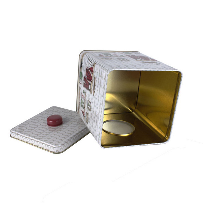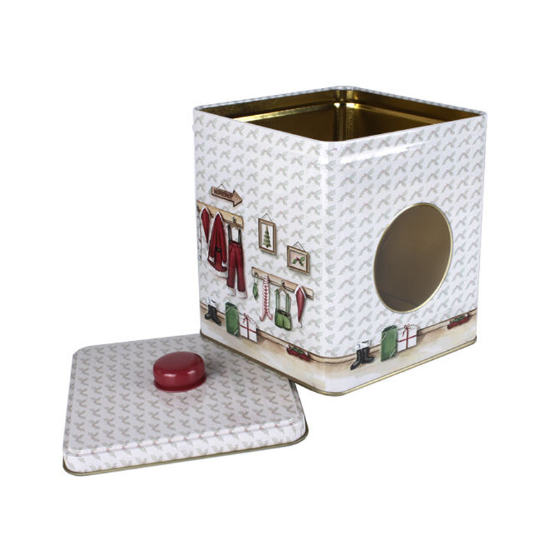 Square metal tin cookie jar biscuit storage box with clear window and knob