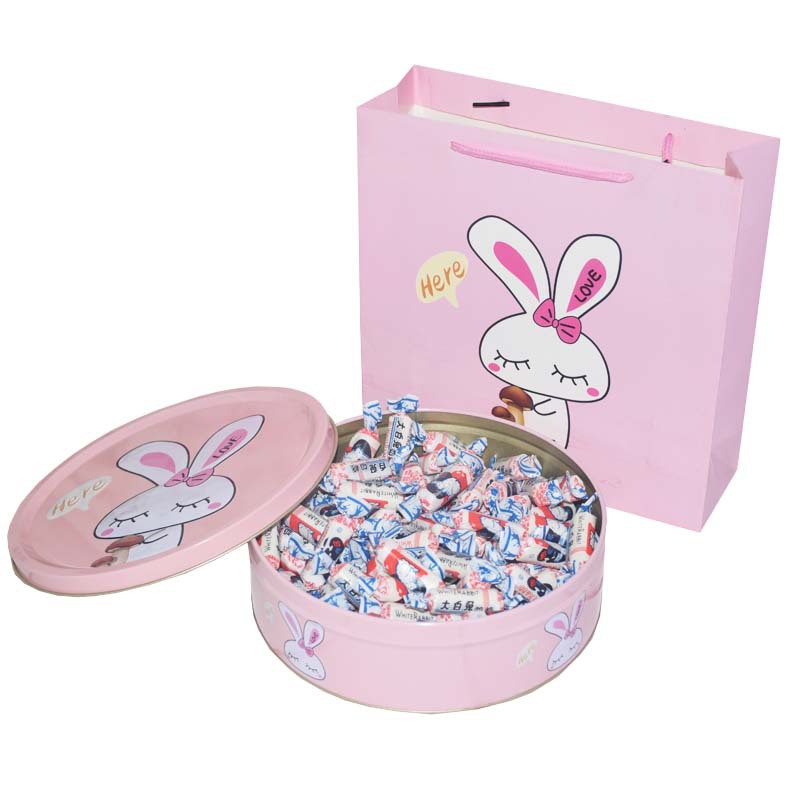 food grade circular tinplate cookie box nuts tin candy container with gift paper bag |