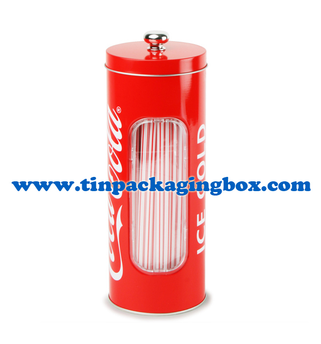 Promotional round tin can straw dispenser with clear PVC window and silver knob